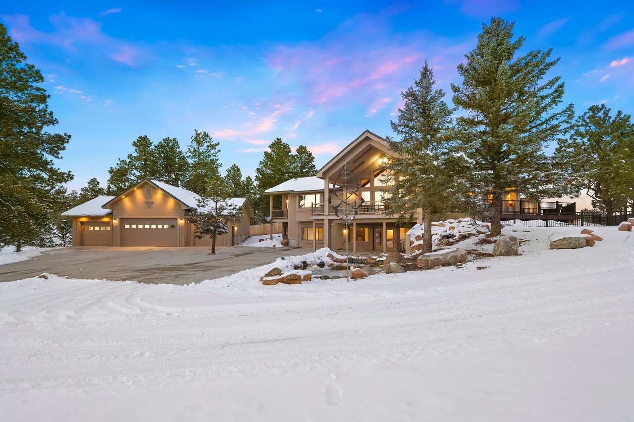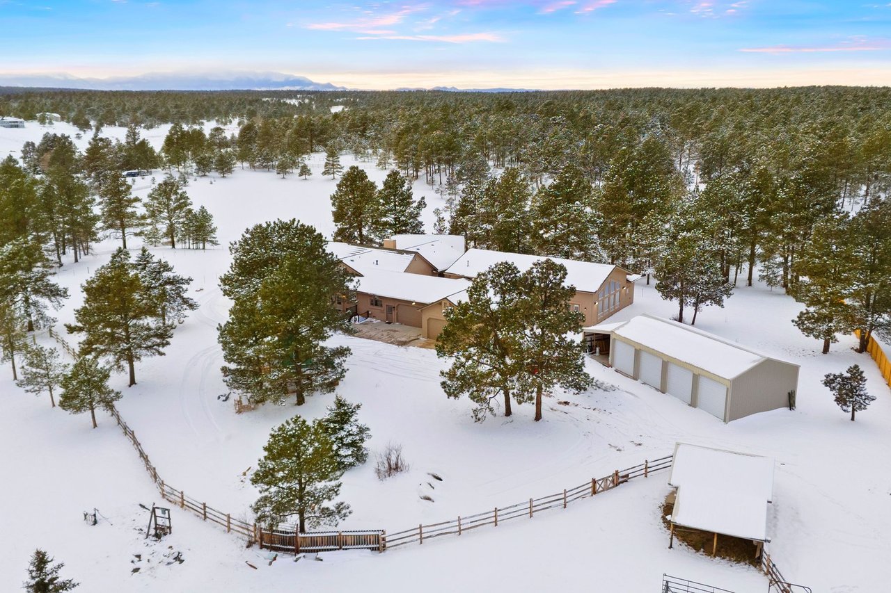 Phenomenal opportunity on 15 acres of lush green meadows and towering pines in sought after Black Forest! Custom built and remodeled home with almost 7,200 square feet w/ an indoor hot tub and pool with a water slide. Multiple heated garages w/ parking for 17 vehicles. 4 stall 32x48 barn with electric, tack room, large sliding doors. 50x36 heated detached garage, epoxy floors, built-in workshop cabinetry and sink. 48x24 detached metal garage with 4 - 10ftx10ft doors. 6 car attached finished, insulated and heated w/ 220V and 50 amp. Expansive and open floor plan flooded w/ natural light from the numerous over-sized windows. New wide plank white oak stone core flooring, high end 50 year rubber coated metal roof, new high end lighting throughout, central AC, multiple ensuite bedrooms, RH knobs throughout, Cambria counters, Brizo and Studio by McGee plumbing fixtures, new carpet, freshly painted. Gorgeous kitchen w/ a huge island, gas cook-top, new commercial grade appliances, huge pantry, slab granite counters. Massive great room w/ a wall of large windows, gas fireplace w/ entire wall of Telluride stone, wood beamed ceilings and large metal chandelier. Main level primary suite w/ private deck, walk-in closet and fully remodeled bath. The primary suite is spa like w/ a standalone tub, tub filler w/ wand, beautiful shower w/ multiple showerheads and wand, high end tile, backlit mirrors. Tons of outdoor entertaining space - a 40x14 covered wraparound composite deck, 14x33 patio, flagstone patio. Serene peaceful pond with two waterfalls and lighting. 10ftx6ft concrete safe room w/ steel door. Indoor pool w/ automated cover, automated chemical feed and test, a water slide, hot tub, wet bar and bathroom w/ 3 shower stalls. Walk-out finished lower level w/ wet bar w/ barrel ceiling, high end DaVinci fireplace and large family room. Perfect equestrian property w/ 3 well hydrants, multiple fenced pastures, perimeter fenced & gated. Whole house automatic generator. No HOA.